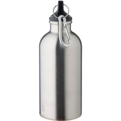 Butelka sportowa 400 ml, ikona recyklingu na produkcie, nie nadaje się do mycia w zmywarce, produkt wykonany ze stali nierdzewnej z recyklingu, nakrętka z PP, srebrny aluminiowy karabińczyk