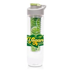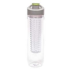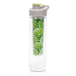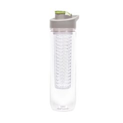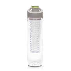 Butelka sportowa 800 ml Air Gifts, posiada pojemnik na lód lub owoce umożliwiający nadanie wodzie smaku według własnych preferencji, szara zakrętka z uchwytem ułatwiającym noszenie i kolorowym zamknięciem, butelka przeznaczona wyłącznie do zimnych i niegazowanych napojów, produkt wykonany z Tritanu i PP