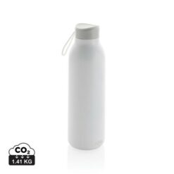 Butelka termiczna 500 ml, podwójne ścianki ze stali nierdzewnej z recyklingu z próżnią pomiędzy, zawartość materiałów z recyklingu obliczona na podstawie wagi całkowitej przedmiotu: 97%, utrzymuje temperaturę napojów ciepłych do 10 godzin oraz zimnych do 20 godzin, pasuje do większości uchwytów samochodowych, w pudełku z certyfikatem FSC®, klasa termiczna: A, ślad węglowy produktu: 1,35 kg CO2