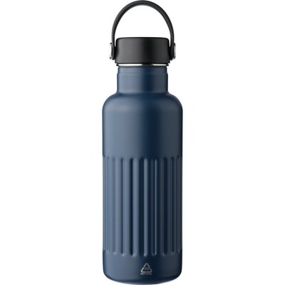 Butelka 500 ml ze stali nierdzewnej, posiada podwójne ścianki, które spowalniają oddawanie temperatury na zewnątrz, zewnętrzna część wykonana jest ze stali nierdzewnej 201, a wewnętrzna ścianka ze stali nierdzewnej 304, pokrywka, żebrowany design, uchwyt ułatwiający noszenie, ikona recyklingu na produkcie, zapakowana w brązowe kartonowe pudełko