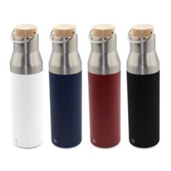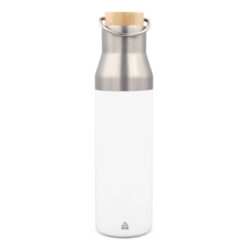 Butelka termiczna 550 ml, posiada podwójne ścianki ze stali nierdzewnej z próżnią między ściankami, co spowalnia oddawanie temperatury na zewnątrz, zachowując funkcje termosu, zakrętka z bambusowym elementem i metalowym uchwytem ułatwiającym noszenie lub przypięcie, produkt wykonany m.in. ze stali nierdzewnej recyklingu, utrzymuje temperaturę napojów gorących do 20 godzin +leakproof