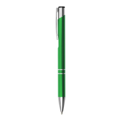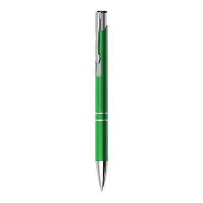 Długopis z kolorowym trzonem o błyszczącym wykończeniu, posiada elementy w srebrnym kolorze, wkład w niebieskim kolorze, produkt wykonany z aluminium