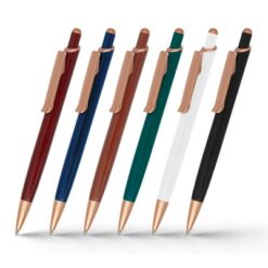 Długopis z kolorowym trzonem i błyszczącymi elementami kolorze różowego złota, wkład w niebieskim kolorze, grawer ukazuje powierzchnię w kolorze złotym, produkt wykonany z aluminium