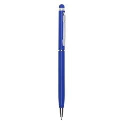 Długopis z kolorowym trzonem o błyszczącym wykończeniu, niewielka średnica nadaje nowoczesnego wyglądu, dopasowana kolorystycznie końcówka touch pen umożliwiająca obsługę ekranów dotykowych, wkład w niebieskim kolorze, produkt wykonany z aluminium
