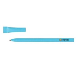 Długopis z dopasowaną kolorystycznie zatyczką, trzon z ciętym zakończeniem, wkład w niebieskim kolorze, produkt wykonany ze zrolowanego papieru