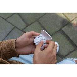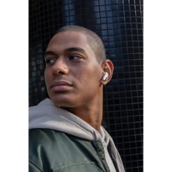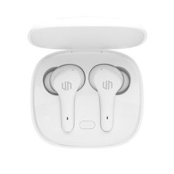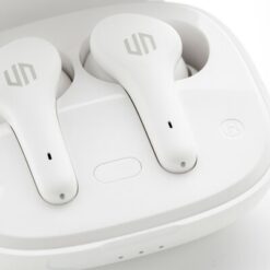 Bezprzewodowe słuchawki douszne z systemem redukcji szumów z otoczenia (ENC), który doskonale sprawdza się podczas rozmów telefonicznych, słuchawki wyposażone są w tryb niskiego opóźnienia (65 ms), dzięki któremu opóźnienie pomiędzy ekranem a dźwiękiem jest minimalizowane, wodoodporne IPX4 (całkowita ochrona przed spryskiwaniem i zachlapaniem wodą z różnych kierunków z natężeniem do 10 litrów na minutę), dotykowy panel sterowania, wbudowany mikrofon, funkcja odbierania połączeń, do 5 godzin odtwarzania na jednym ładowaniu, etui ładujące zapewnia 20 godzin odtwarzania, nie zawiera PVC, opakowanie nie zawiera plastiku, ślad węglowy produktu: 0,93 kg CO2