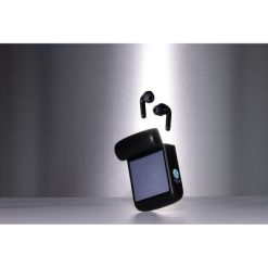 Słuchawki bezprzewodowe BT 5.3, zintegrowany panel słoneczny do ładowania słuchawek, prędkość ładowania solarnego 5V/0,05A, wbudowany mikrofon, funkcja odbierania połączeń, wykonane z ABS z recyklingu z certyfikatem RCS, całkowita zawartość materiałów z recyklingu obliczona w oparciu o wagę całkowitą przedmiotu: 19%, czas odtwarzania na średnim poziomie głośności do 5 godzin, zasięg do 10 m, kabel z TPE z recyklingu z certyfikatem RCS w komplecie, w pudełku z papieru kraftowego z certyfikatem FSC® mix, ślad węglowy produktu: 0,82 kg CO2