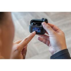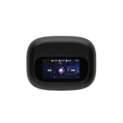 Bezprzewodowe słuchawki douszne z systemem aktywnej redukcji szumów (ANC), poziom redukcji szumów do 23 dB, BT 5.3, posiadają wbudowany ekran dotykowy TFT, który oferuje funkcje takie jak: przełączanie utworów, odbieranie połączeń, regulacja poziomu głośności i wiele innych, wodoodporne IPX4, wbudowany mikrofon, funkcja odbierania połączeń, do 6 godzin odtwarzania na jednym ładowaniu, ponowne naładowanie w etui ładującym w 1,5h, wykonane z ABS z recyklingu z certyfikatem RCS, w komplecie 3 pary nakładek w różnych rozmiarach, całkowita zawartość materiałów z recyklingu obliczona na podstawie wagi całkowitej przedmiotu: 43%, w pudełku z papieru kraftowego z certyfikatem FSC®