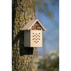 Drewniany domek dla owadów z metalowym haczykiem do zawieszenia