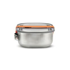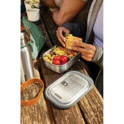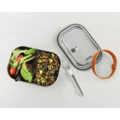 Pudełko śniadaniowe, lunchbox 3 w 1, nadaje się do przechowywania śniadania, mrożenia potraw oraz pieczenia w piekarniku, wykonane ze stali nierdzewnej z recyklingu, w komplecie łyżkowidelec, elastyczny pasek oraz przesuwana przegroda, podstawka oraz łyżkowidelec nadają się do mycia w zmywarce