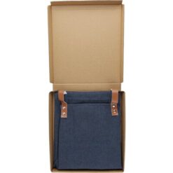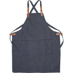 Fartuch kuchenny z denimu, do noszenia na ramionach poprzez włożenie pasków w dołączone szlufki z boku, 2 przednie kieszenie z przodu, zapakowany w brązowy kartonik, produkt wykonany z denimu, bawełny 65%/35%, poliestru o gramaturze 280 g/m2