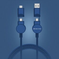Szybki kabel do ładowania z 5 końcówkami: USB, 2x typu C i 2 w 1, micro USB, iOS, moc maksymalna ładowania USB C do USB C 45W, USB C do iOS 18W, obudowa wykonana z TPE i PET pochodzących z recyklingu, posiadają certyfikat RCS (Recycled Claim Standard), który jest stosowany gdy produkt jest wykonany częściowo lub w całości z materiałów pochodzących z recyklingu, długość 120 cm, nie zawiera PVC, ślad węglowy produktu: 0,36 kg CO2
