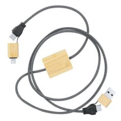 Kabel do ładowania i synchronizacji z 4 końcówkami: 2x USB-C, micro USB oraz kompatybilna z urządzeniami iOS, nadaje się do szybkiego ładowania urządzeń mobilnych do 60W, produkt wykonany z bambusa i poliestru RPET