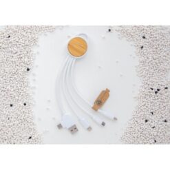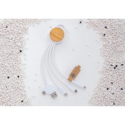 Kabel do ładowania, końcówki: USB, 2 x USB C, micro USB, iOS, obudowa wykonana z bambusa z certyfikatem FSC® i ABS z recyklingu, kabel wykonany z TPE z recyklingu, kabel i obudowa posiadają certyfikaty RCS, długość 20 cm, nie zawiera PVC, ślad węglowy produktu: 0,15 kg CO2