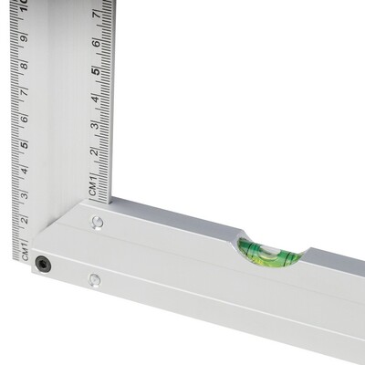Kątownik 30 cm, poziomica, pomiar w cm, zapakowany pojedynczo w brązowy kartonik, produkt wykonany z aluminium