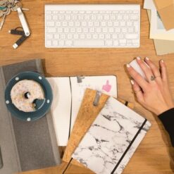 Notatnik A5 (80 kartek 80 g/m2 w linie), wykonany z naturalnego korka, czarna tasiemka zakładkowa, elastyczna opaska do zamykania, bambusowy długopis, touch pen, ślad węglowy produktu: 0,68 kg CO2