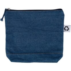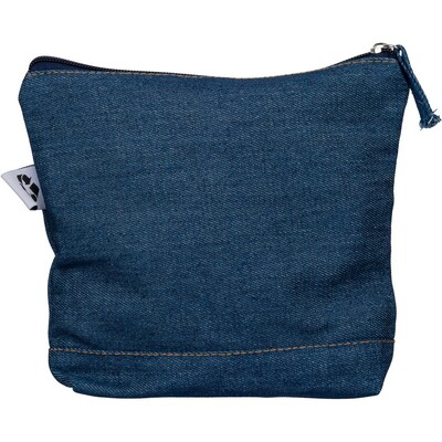 Kosmetyczka, kieszeń zapinana na zamek, ikona recyklingu na metce, produkt wykonany z denimu z recyklingu