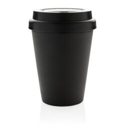 Kubek termiczny 300 ml, lekki, trwały i wielokrotnego użytku, wykonany z materiału PP w 100% nadającego się do recyklingu, podwójne ścianki, zakręcane wieczko, odporny na temperaturę do 100 stopni Celsjusza, wyłącznie mycie ręczne, ślad węglowy produktu: 0,36 kg CO2