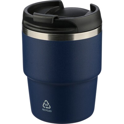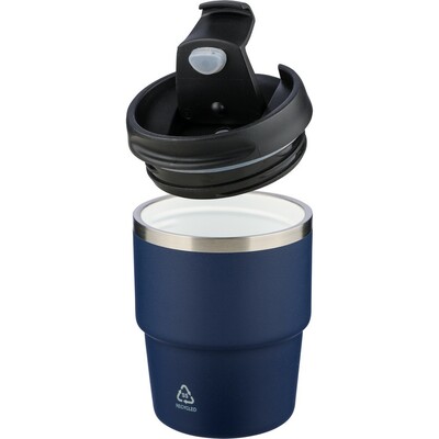Kubek termiczny 175 ml, posiada podwójne ścianki ze stali nierdzewnej z próżnią między ściankami, co spowalnia oddawanie temperatury na zewnątrz, zachowując funkcje termosu, ikona recyklingu na produkcie, zapakowany pojedynczo w brązowe kartonowe pudełko, produkt wykonany z recyklingowej stali nierdzewnej (wewnątrz 304 / na zewnątrz 201) z pokrywką z PP