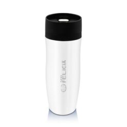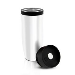 Kubek termiczny 375 ml Air Gifts, posiada podwójne ścianki ze stali nierdzewnej z miedzianą izolacją próżniową, co spowalnia oddawanie temperatury na zewnątrz, zachowując funkcje termosu, plastikowe wieczko z przyciskiem otwarcia/zamknięcia ustnika umożliwiającym obsługę jedną ręką, błyszczące wykończenie, utrzymuje temperaturę napojów gorących do 20 godzin +leakproof