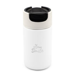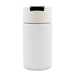 Kubek termiczny 400 ml Air Gifts, posiada podwójne ścianki ze stali nierdzewnej i ceramiki z próżnią między ściankami, co spowalnia oddawanie temperatury na zewnątrz, zachowując funkcje termosu, plastikowe wieczko z zamknięciem umożliwiającym obsługę jedną ręką, matowe wykończenie, produkt wykonany z metalu, ceramiki i plastiku, utrzymuje temperaturę napojów gorących do 10 godzin +leakproof