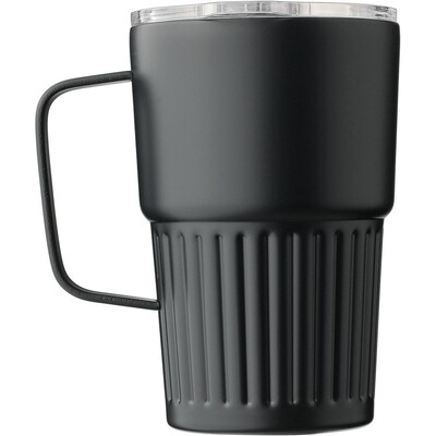 Kubek termiczny 450 ml ze stali nierdzewnej, posiada podwójne ścianki, które spowalniają oddawanie temperatury na zewnątrz, zewnętrzna część wykonana jest ze stali nierdzewnej 201, a wewnętrzna ścianka ze stali nierdzewnej 304, uchwyt ułatwiający noszenie, wieczko z zamknięciem wykonane z AS, ikona recyklingu na produkcie, zapakowany w brązowe kartonowe pudełko