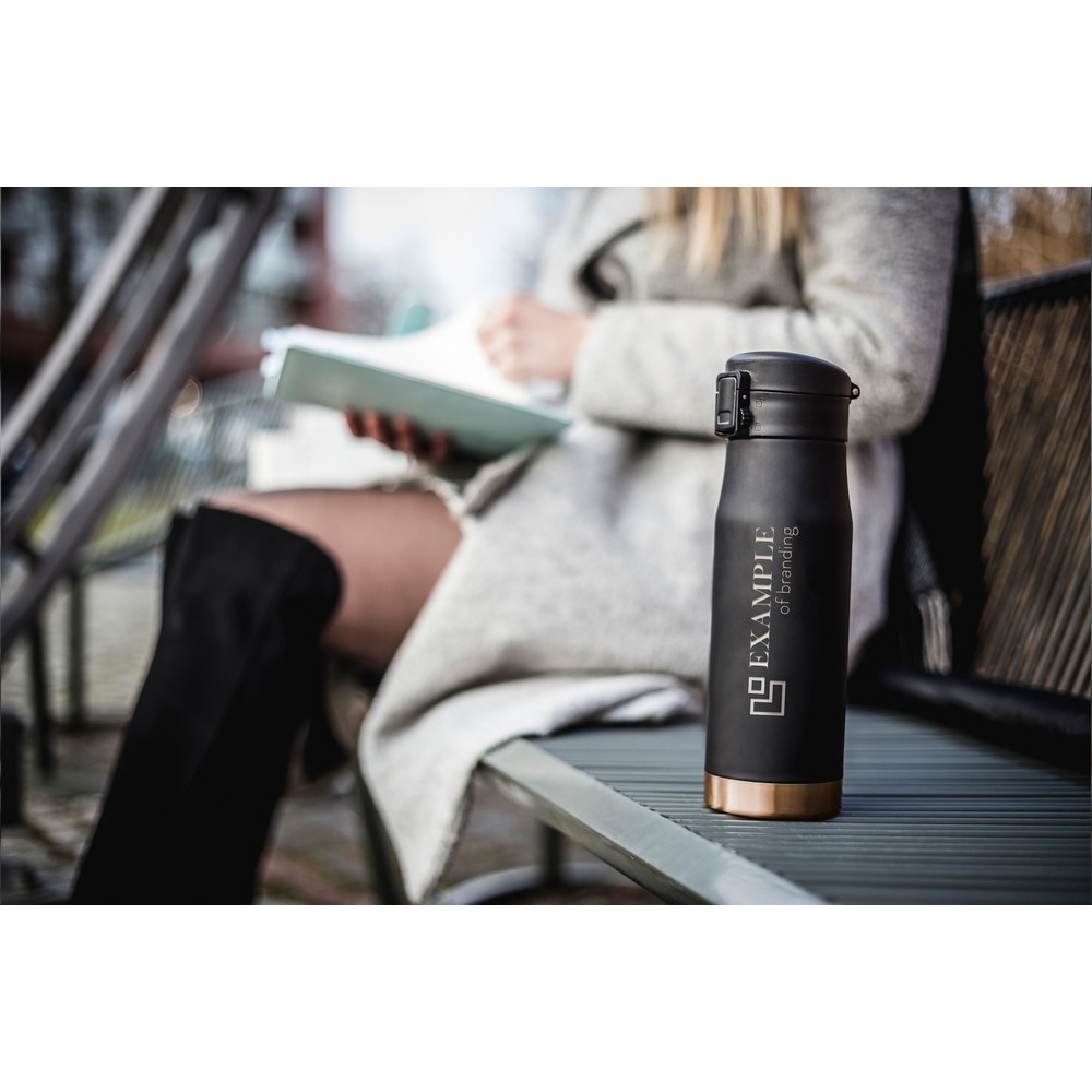 Kubek termiczny 600 ml Mauro Conti, posiada podwójne ścianki ze stali nierdzewnej z miedzianą izolacją próżniową, co spowalnia oddawanie temperatury na zewnątrz, zachowując funkcje termosu, wieczko z blokadą i przyciskiem otwarcia ustnika umożliwiającym obsługę jedną ręką, utrzymuje temperaturę napojów gorących do 15 godzin +leakproof