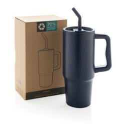 Kubek termiczny 900 ml, wykonany ze stali nierdzewnej z recyklingu, podwójne ścianki ze stali nierdzewnej z próżnią pomiędzy, zakręcane wieczko z dziubkiem i słomką, zalecane mycie ręczne, ślad węglowy produktu: 0 kg CO2