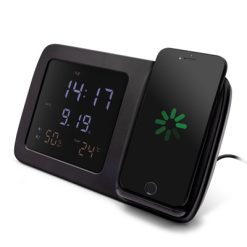 Ładowarka bezprzewodowa 5W-15W Exclusive Collection, wbudowany zegar cyfrowy, funkcje: alarm, temperatura, wilgotność powietrza, zegar i data, działa z urządzeniami posiadającymi możliwość ładowania indukcyjnego, grawer ukazuje podświetlaną powierzchnię, kabel USB-C w komplecie