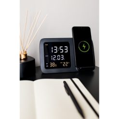 Ładowarka bezprzewodowa 5W-15W Exclusive Collection, wielofunkcyjny zegar cyfrowy | Isha z nadrukiem Twojego logo, materiał: plastik, kolor: czarny