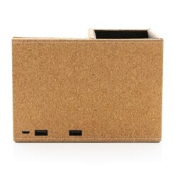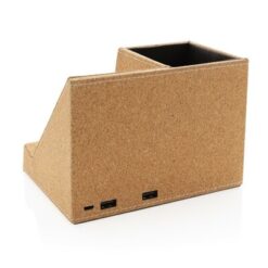 Ładowarka bezprzewodowa 5W, stojak na przybory do pisania, wykonana z naturalnego korka, posiada 2 porty USB do ładowania, bezprzewodowe ładowanie jest kompatybilne ze wszystkimi urządzeniami posiadającymi możliwość ładowania indukcyjnego, wejście 5V/2A, wyjście bezprzewodowe 5/1A 5W, wyjścia 2xUSB 5V/2A, kabel micro USB 150 cm wykonany z mieszanki 15% słomy pszenicznej i TPE w komplecie, nie zawiera PVC, ślad węglowy produktu: 1,58 kg CO2