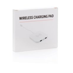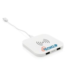 Ładowarka bezprzewodowa 5W, wykonana z ABS, dwa wyjścia USB do ładowania telefonów starszej generacji za pomocą kabla, bezprzewodowe ładowanie jest kompatybilne ze wszystkimi urządzeniami posiadającymi możliwość ładowania indukcyjnego, wejście 1A, wyjście USB 5V/1A, wyjście bezprzewodowe 5W, ślad węglowy produktu: 1,06 kg CO2