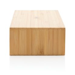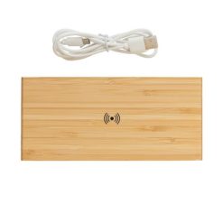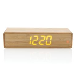 Ładowarka bezprzewodowa 5W, wbudowany zegar cyfrowy, obudowa wykonana z naturalnego bambusa, wejście USB do ładowania za pomocą kabla, bezprzewodowe ładowanie jest kompatybilne ze wszystkimi urządzeniami posiadającymi możliwość ładowania indukcyjnego, wejście 5V/1.5A, wyjście USB 5V/1A, wyjście bezprzewodowe 5V/1A 5W, ślad węglowy produktu: 1,4 kg CO2