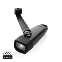 Latarka LED z dynamo, moc 120 lumenów, wbudowany akumulator o pojemności 620 mAh pozwala na świecenie do 2 godzin na jednym ładowaniu, wejście USB typu C, wykonana z ABS z recyklingu z certyfikatem RCS, całkowita zawartość materiałów obliczona na podstawie wagi całkowitej przedmiotu: 30%, ślad węglowy produktu: 0 kg CO2