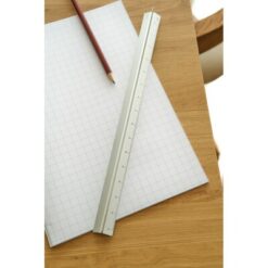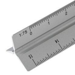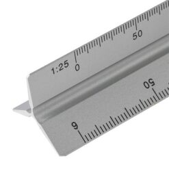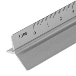 Linijka trójkątna 30 cm z różnymi skalami: 1:20, 1:25, 1:50, 1:75 , 1:100, pakowana pojedynczo w brązowe kartonowe pudełko z ilustracją, produkt wykonany z aluminium