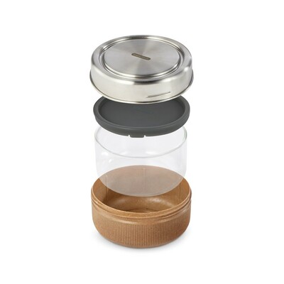 Pudełko śniadaniowe 750 ml, wykonane ze szkła, podstawa pojemnika wykonana jest z polipropylenu połączonego z włóknem drzewnym, metalowe wieczko, można myć w zmywarce
