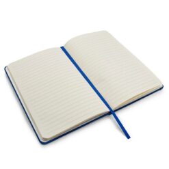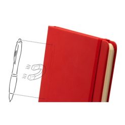 Notatnik A5 (80 kartek w linie), twarda okładka z PU z wbudowanym magnesem umożliwiającym przyczepienie przyborów do pisania (nie dołączone), tasiemka zakładkowa i elastyczna opaska do zamykania