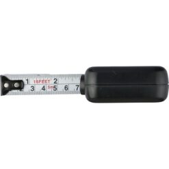 Miara o długości 5 metrów w centymetrach i calach, blokada przyciskowa poprawiająca komfort użytkowania oraz umożliwiająca samodzielne mierzenie, zapakowana w brązowy kartonik, produkt wykonany z ABS