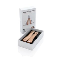 Trwałe i wytrzymałe narzędzie wielofunkcyjne, wykonane z wysokiej jakości stali nierdzewnej, uchwyt z drewna bukowego, 13 funkcji: długie szczypce, kombinerki, przecinak do kabli i drutu, ostrze ząbkowane, otwieracz do butelek, duży śrubokręt płaski, śrubokręt krzyżakowy, nóż, piła, mały śrubokręt płaski, otwieracz do puszek, średni śrubokręt płaski, pilnik, w ozdobnym pudełku, ślad węglowy produktu: 1,01 kg CO2