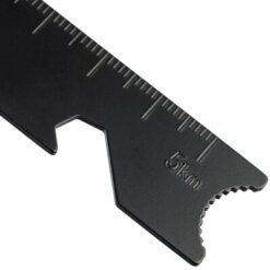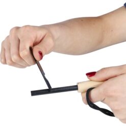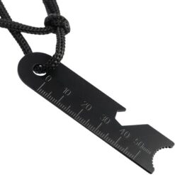 Wielofunkcyjne narzędzie, funkcje: krzesiwo, skrobak, otwieracz do butelek, klucz sześciokątny, sznurek ułatwiający noszenie zapakowane w brązowe kartonowe pudełko, produkt wykonany z metalu i drewna sosnowego