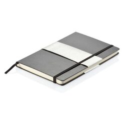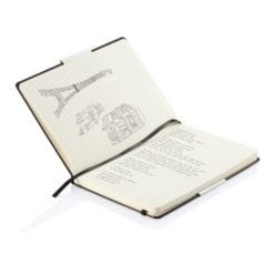 Notatnik A5 (80 kremowych kartek 80 g/m2 w linie), twarda okładka, tasiemka zakładkowa, elastyczna opaska do zamykania, obwoluta, zaokrąglone rogi, ślad węglowy produktu: 0,7 kg CO2