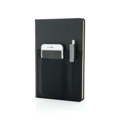 Notatnik A5 (80 kremowych kartek 80 g/m2 w linie), kieszenie na okładce, w tym na telefon (do 8 cm szerokości), miejsce na przybory do pisania, duża kieszeń na dokumenty, ślad węglowy produktu: 0,69 kg CO2