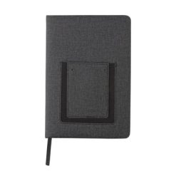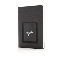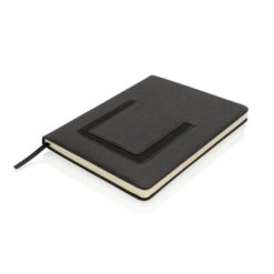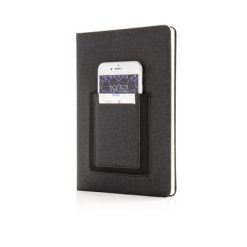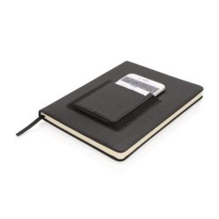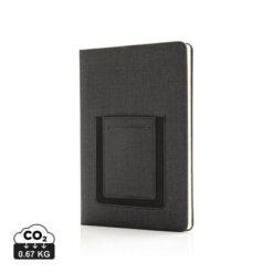 Notatnik A5 (80 kremowych kartek 78 g/m2), posiada kieszeń na telefon i miejsce na kartę kredytową, tasiemka zakładkowa, ślad węglowy produktu: 0,67 kg CO2