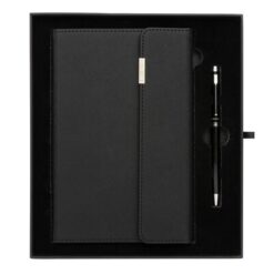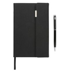 Luksusowy notatnik A5 (80 kremowych kartek 80 g/m2 w linie), okładka wykonana z PU z metalowym logo, długopis z niemieckim wkładem w komplecie, długość pisania ok. 1200 m, w ozdobnym pudełku, ślad węglowy produktu: 1,34 kg CO2