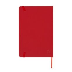 Notatnik w formacie A5, posiada 80 kartek w linie (160 stron), dodatkowe zamknięcie w postaci dopasowanej kolorystycznie elastycznej opaski, twarda okładka wykonana z PU z recyklingu, kartki z papieru z recyklingu