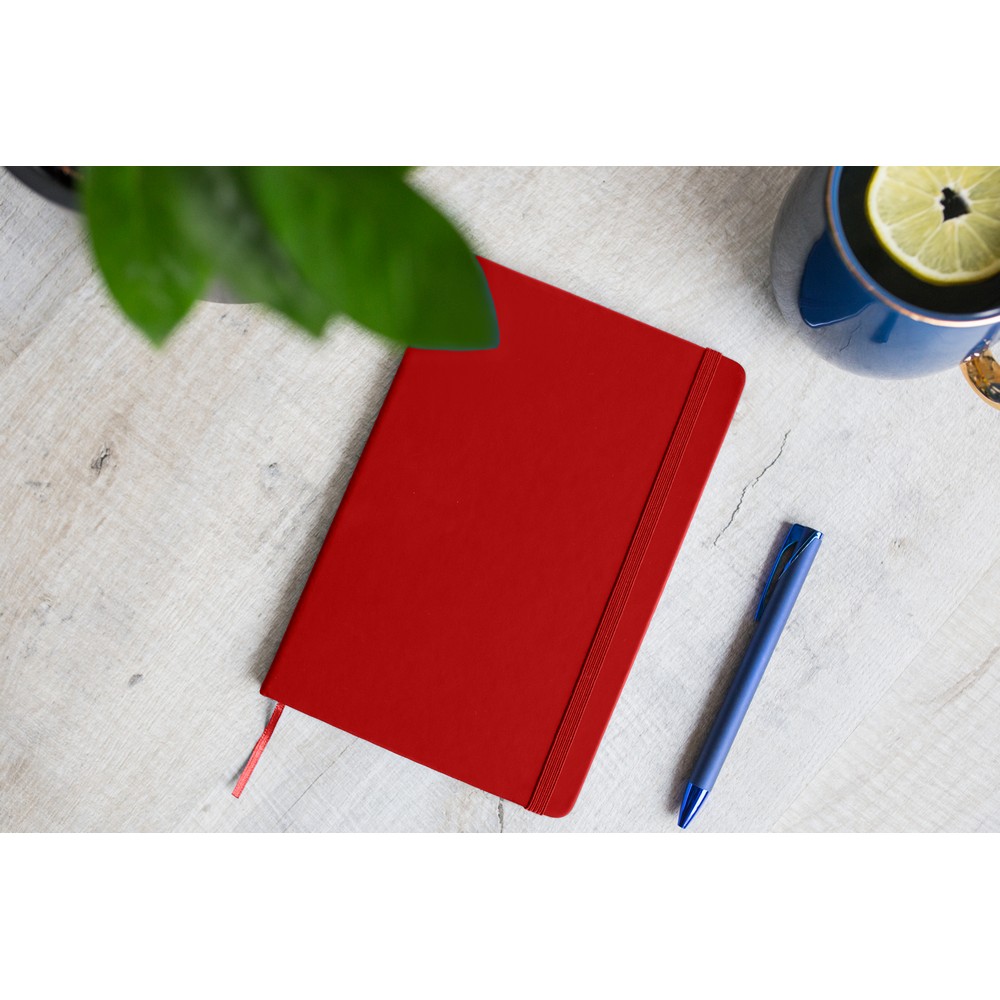 Notatnik w formacie A5, posiada 80 kartek w linie (160 stron), dodatkowe zamknięcie w postaci dopasowanej kolorystycznie elastycznej opaski, twarda okładka wykonana z PU z recyklingu, kartki z papieru z recyklingu