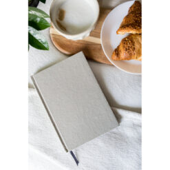 Notatnik B’RIGHT w formacie ok. A5, posiada 80 kartek w linie (160 stron), tasiemka zakładkowa umożliwia wygodne zaznaczanie ostatniej strony lub ważniejszych notatek, twarda okładka wykonana z bawełny z recyklingu, kartki z papieru z recyklingu