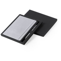 Notatnik (ok. A5, 80 pustych kartek), twarda okładka, tasiemka zakładkowa i elastyczna opaska do zamykania, pióro kulkowe w komplecie, w pudełku podarunkowym