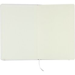 Notatnik ok. A5 RPET, z twardą okładką wykonaną z RPET PU, zawierający 80 stron w linie (70 g/m²), tasiemka zakładkowa umożliwia wygodne zaznaczanie ostatniej strony lub ważniejszych notatek, dodatkowe zamknięcie w postaci kolorowej elastycznej opaski, ikona recyklingu na tylnej stronie