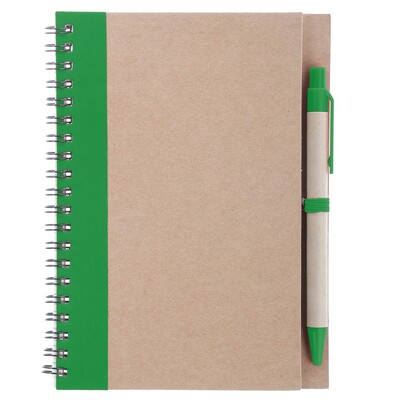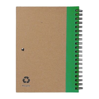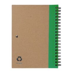 Notatnik w formacie ok. A5, posiada 60 kartek w linie (120 stron) i spiralne bindowanie, w komplecie znajduje się długopis z kolorowymi elementami, wkład w niebieskim kolorze, okładka wykonana z kartonu z kolorowym elementem przy bindowaniu